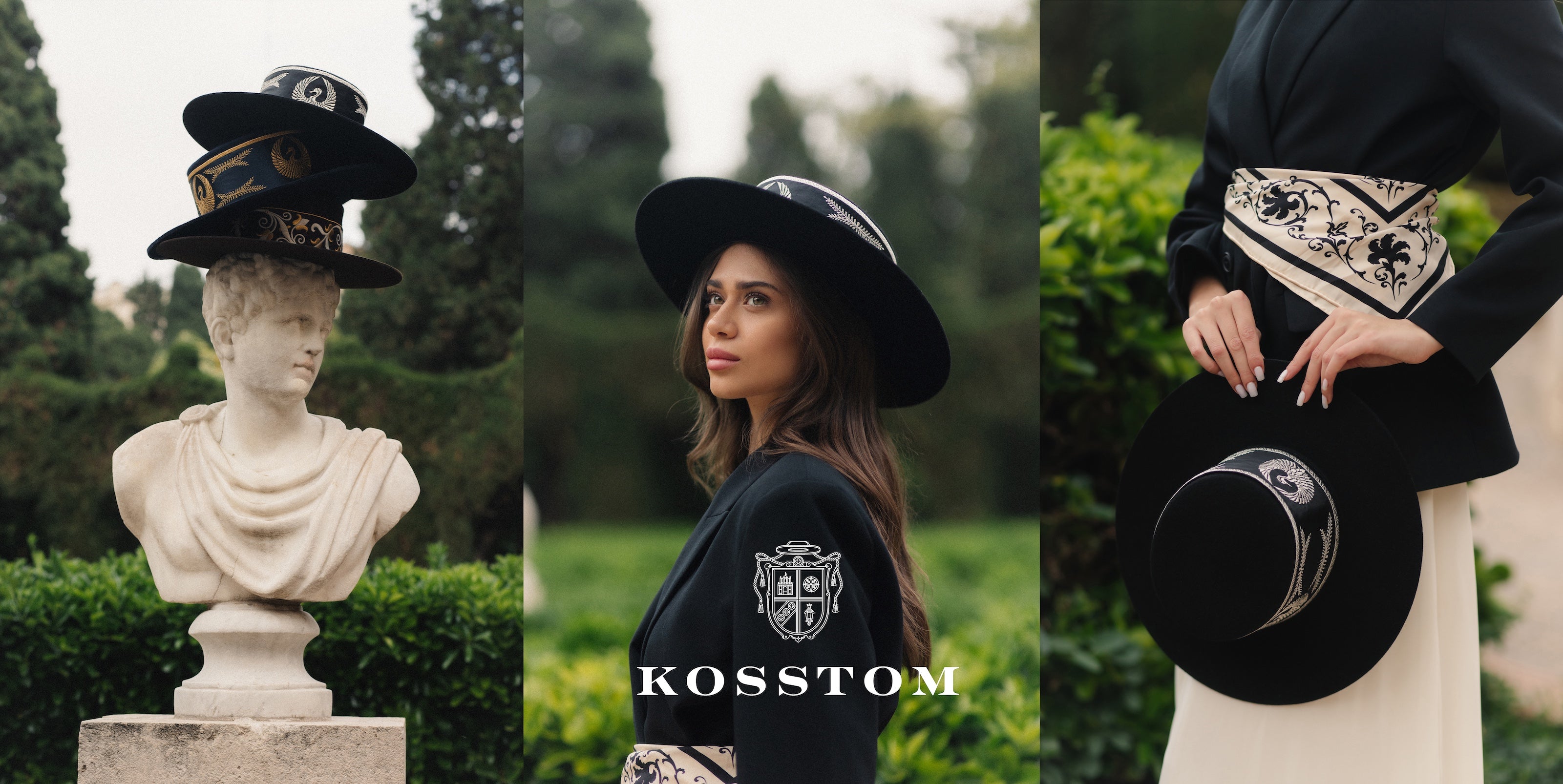 Kosstom draws on centuries honed craftsmanship to design and curate luxury hats with an embroidery finish. Each hat is handmade, drawing on traditional hat making techniques and contemporary designs to create pieces that have a unique and timeless flair.